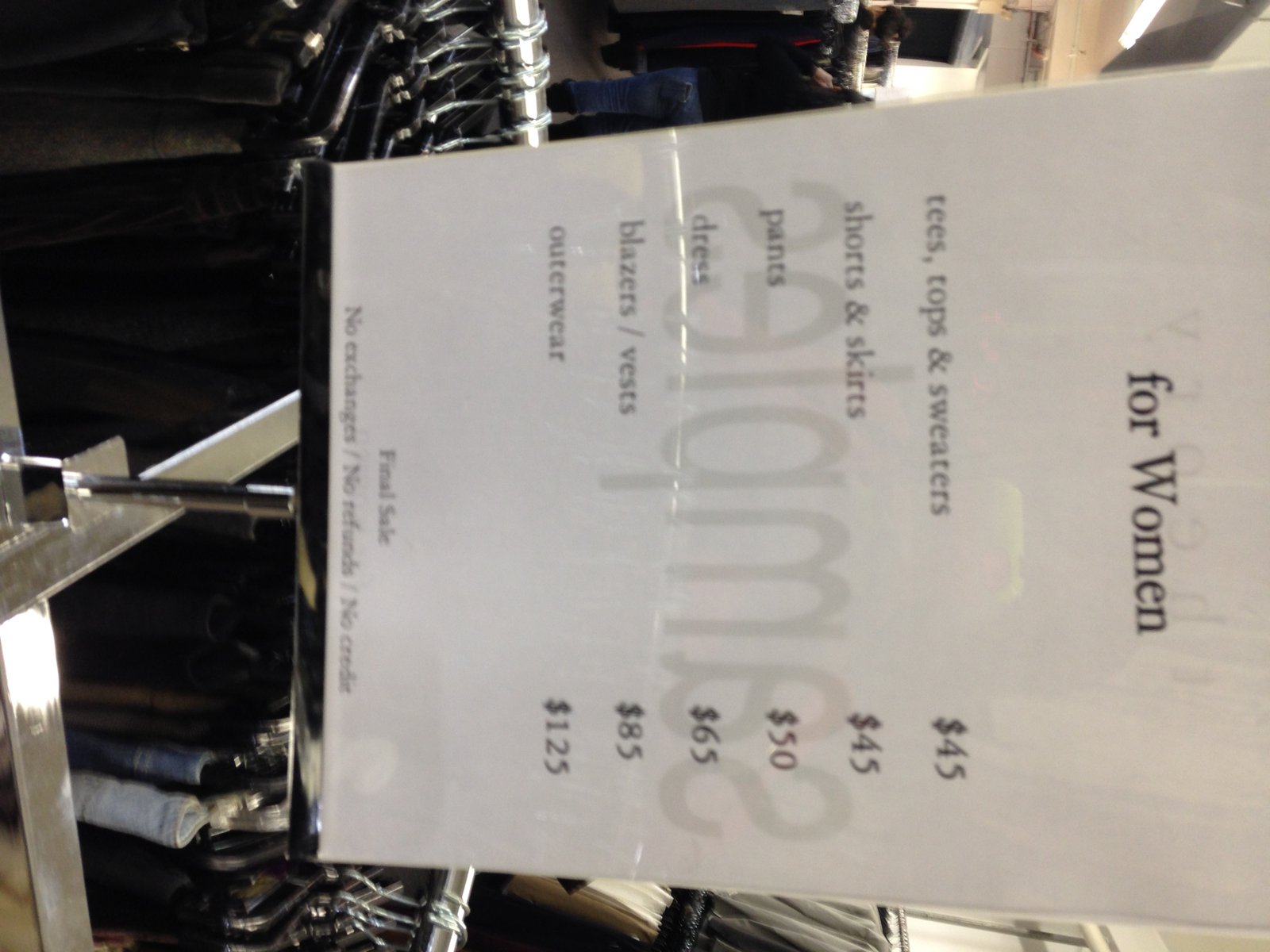 The Theory portion of the sale is more promising, offering more clothing choices for work wear. Even the mens’ section although limited had a healthy selection of basic tees, button down shirts, pants, and blazers. For women, blazers are available in basic neutrals and colors in sizes 0-12. Lots of denim jackets, shirts and dresses, along with career appropriate dresses and button shirts, and blouses.