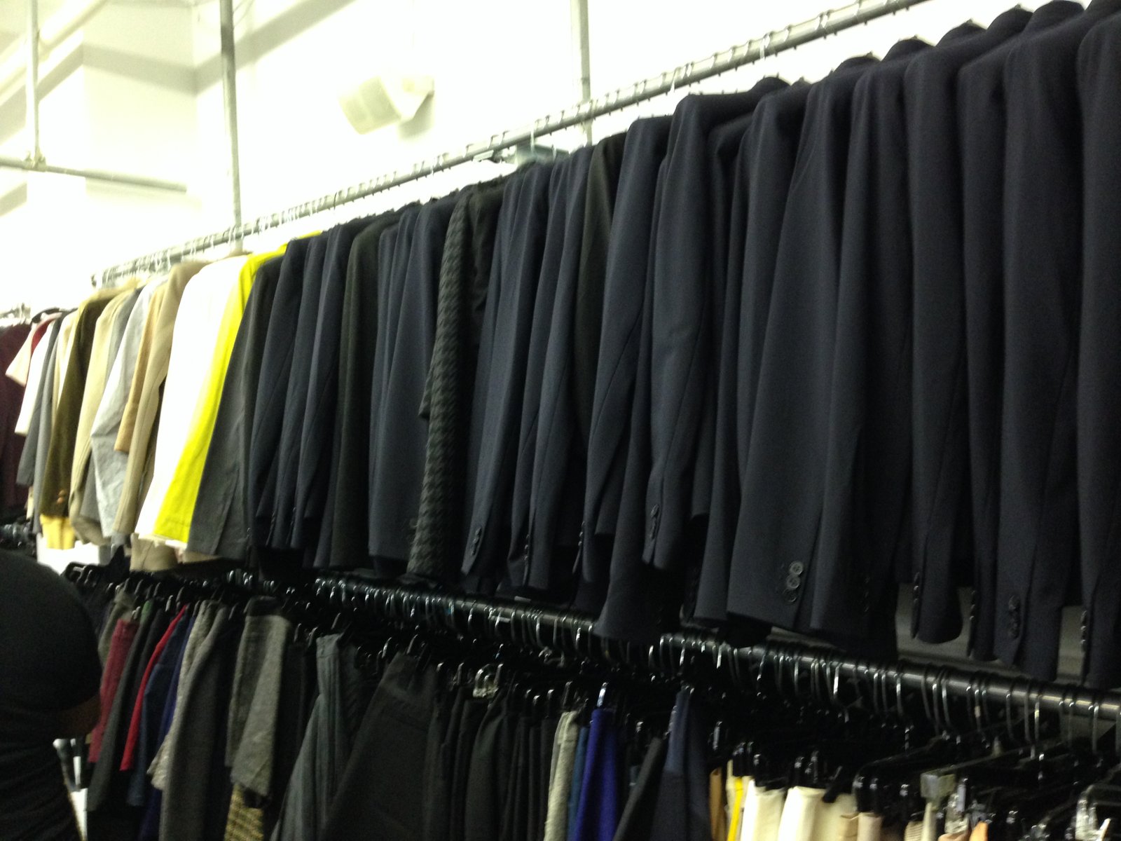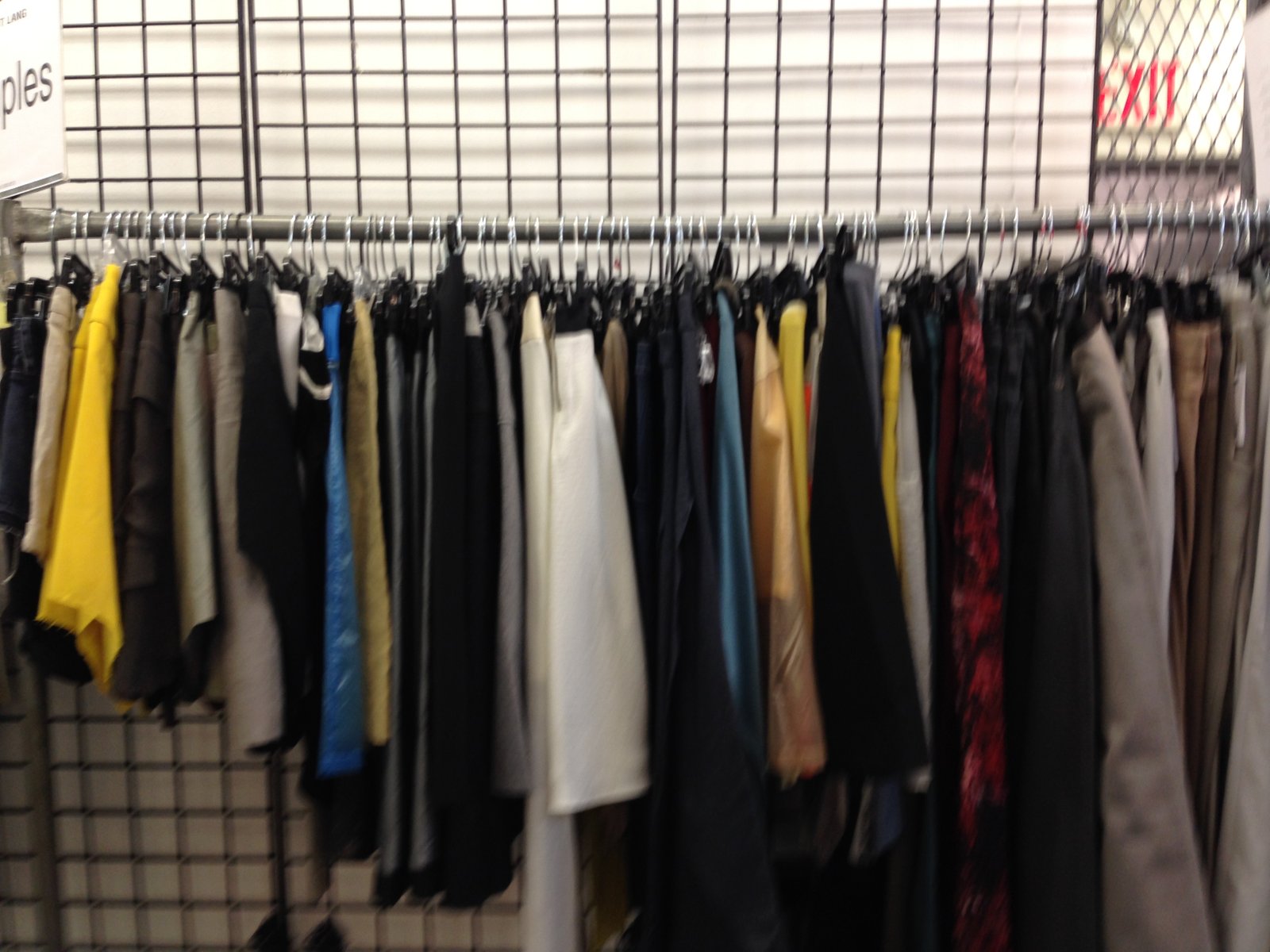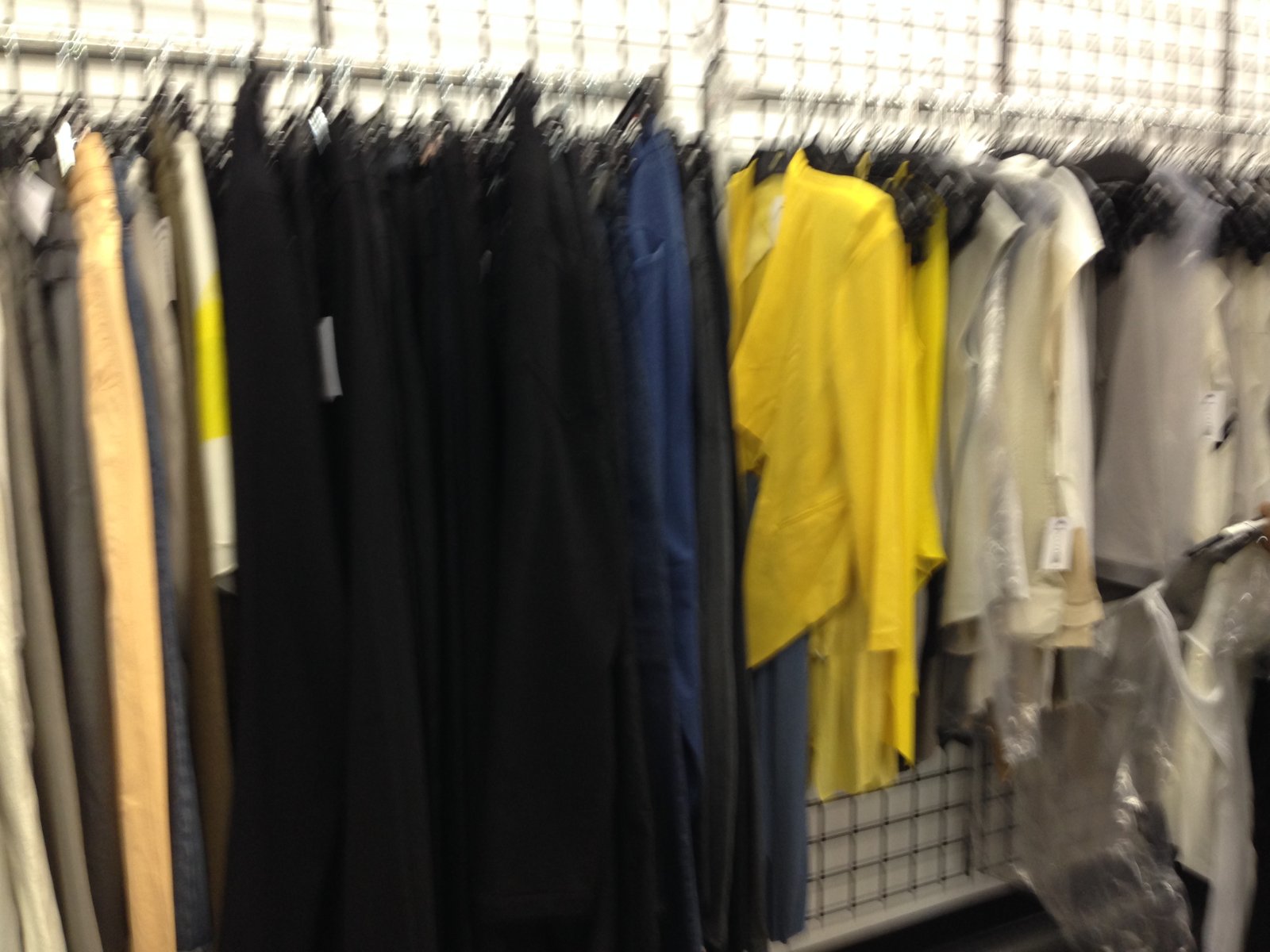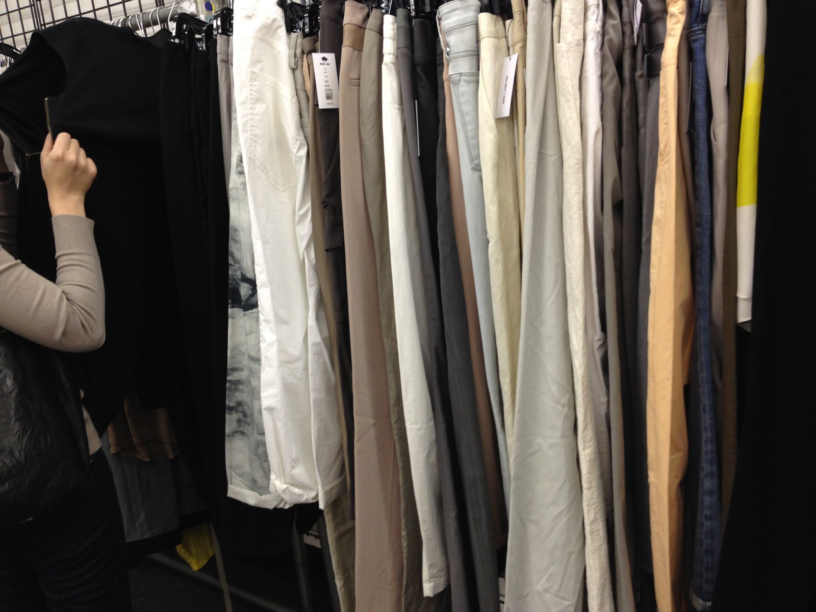 As usual, the Helmut Lang section of the sale was very picked over. There were a few black blazers (mostly in sizes 6-8, and a few 0’s), white blazers with leather off white leather sleeves though sizes and quantities are scarce. left There were some interesting sample pieces such are drapey bright colored dresses and yellow sample blazers, and shorts. The only section that seemed promising were the pants section from Helmut Lang. The sale boasted at least four racks of pants and leggings in a variety of colors and textures.