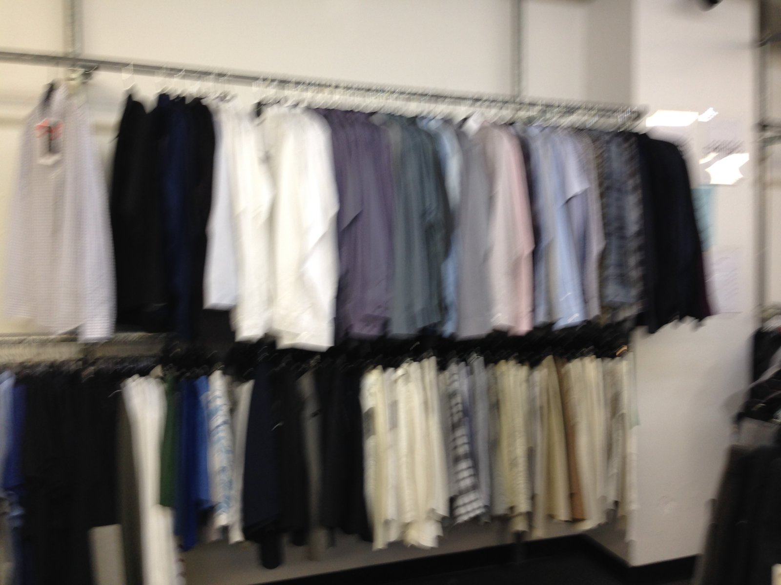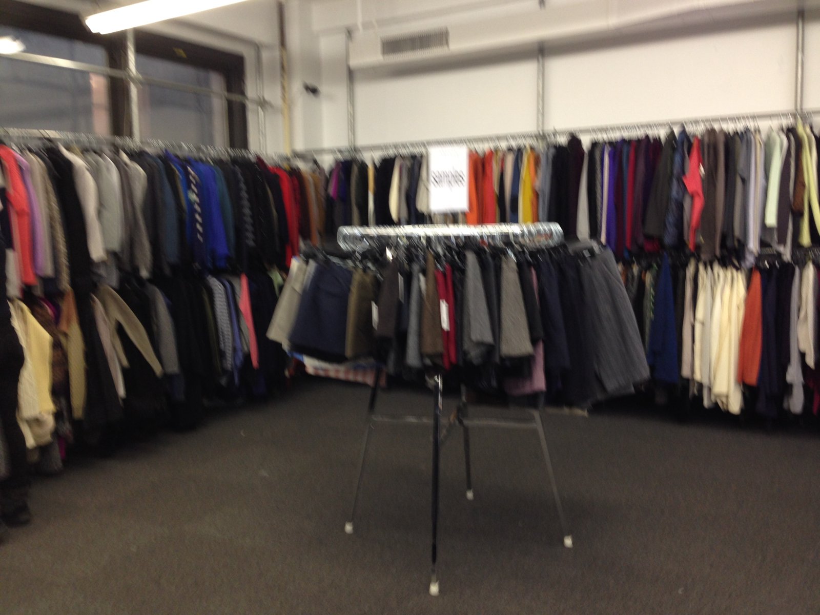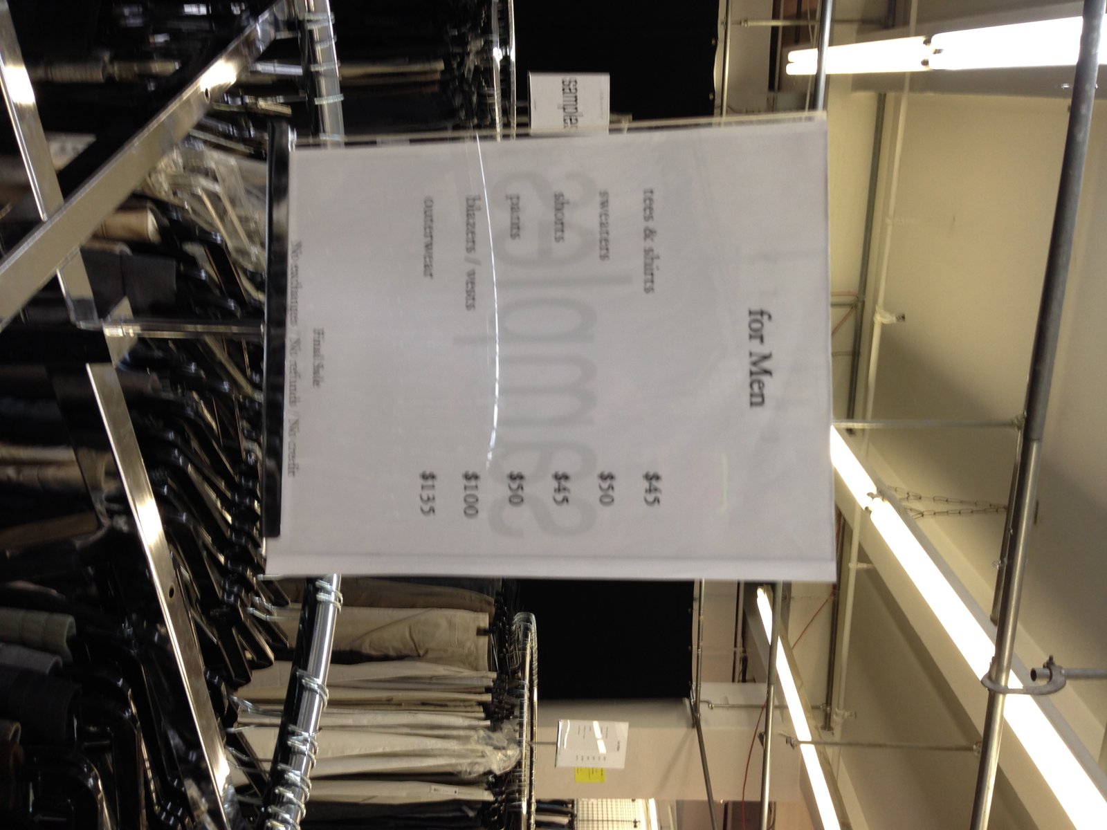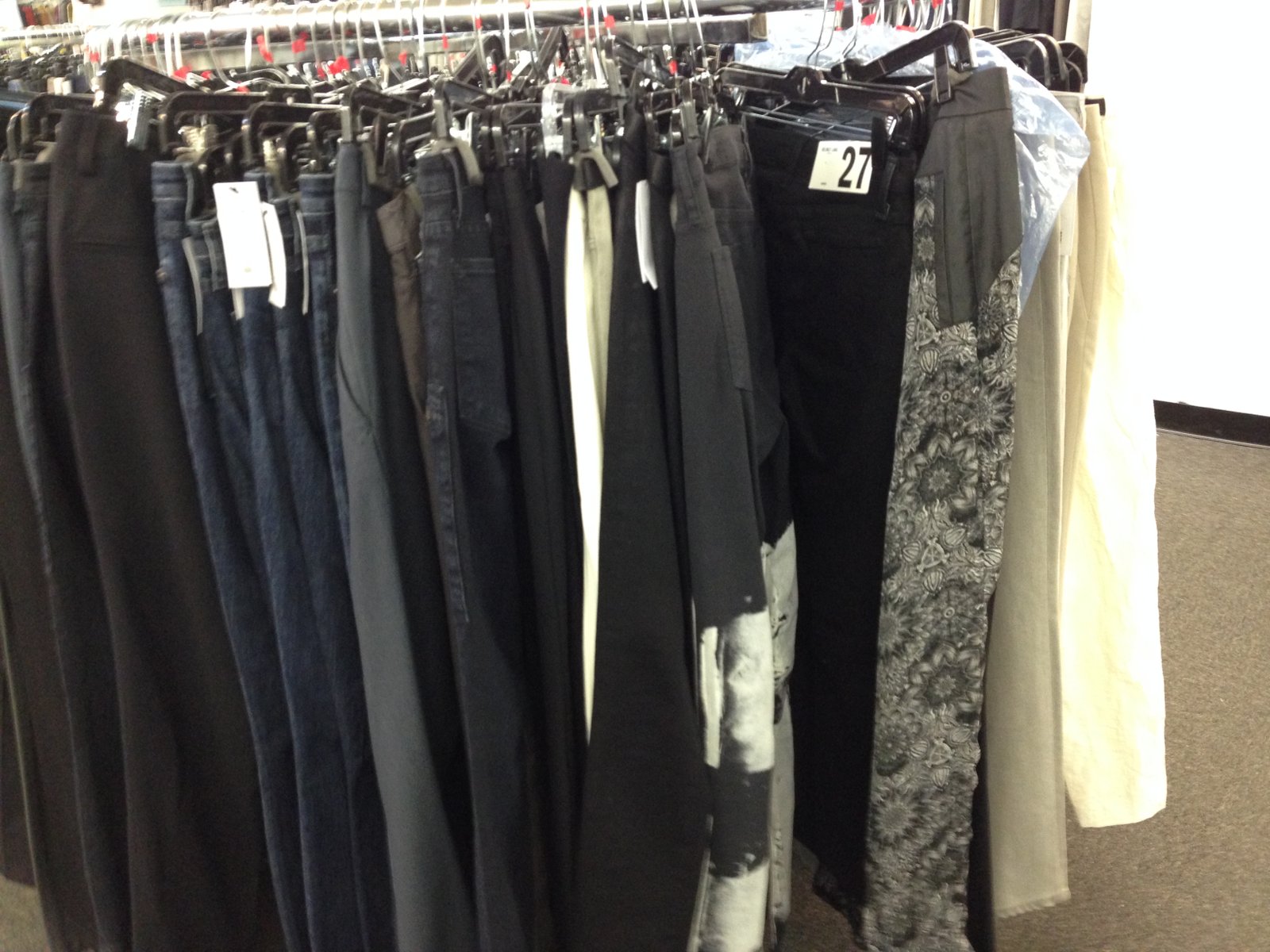 As usual, the Helmut Lang section of the sale was very picked over. There were a few black blazers (mostly in sizes 6-8, and a few 0’s), white blazers with leather off white leather sleeves though sizes and quantities are scarce. left There were some interesting sample pieces such are drapey bright colored dresses and yellow sample blazers, and shorts. The only section that seemed promising were the pants section from Helmut Lang. The sale boasted at least four racks of pants and leggings in a variety of colors and textures.